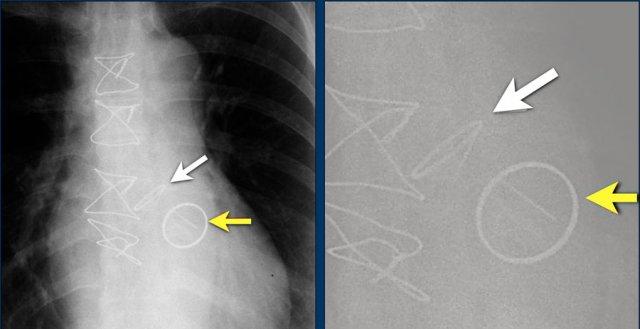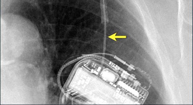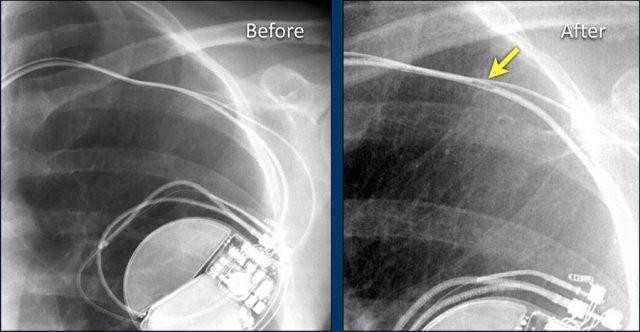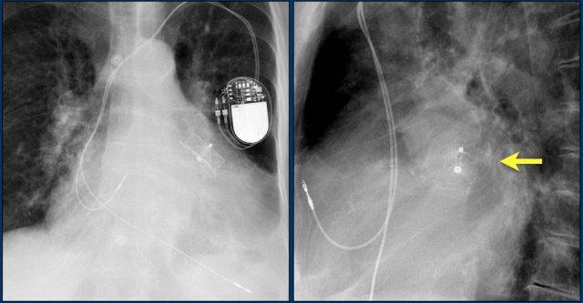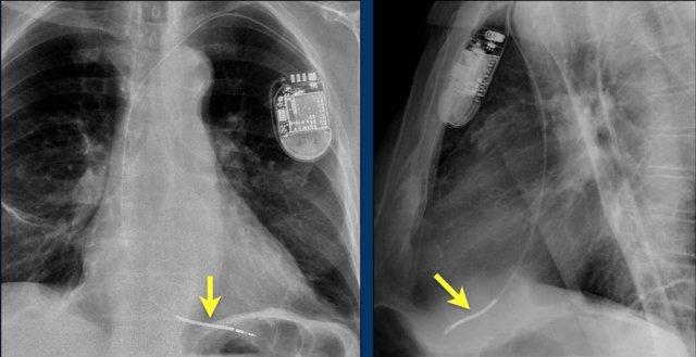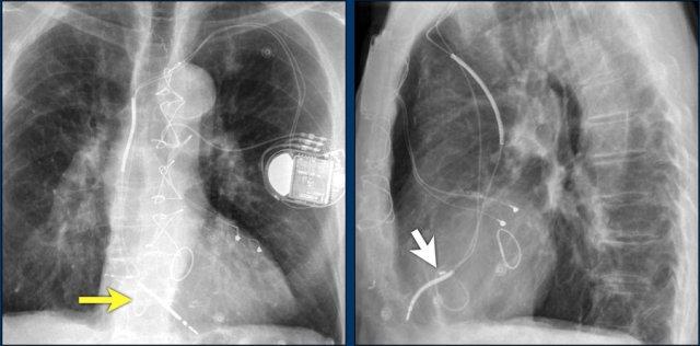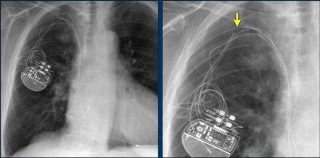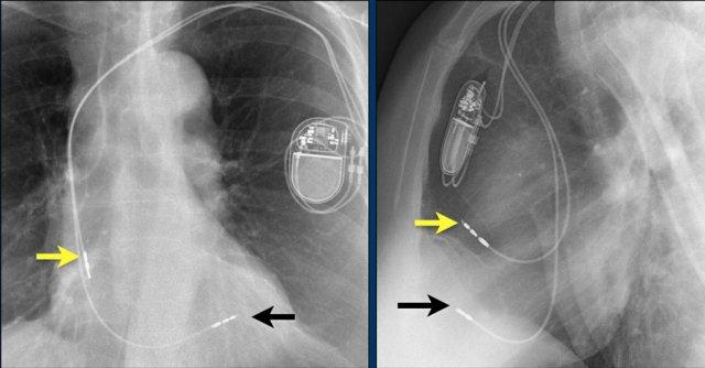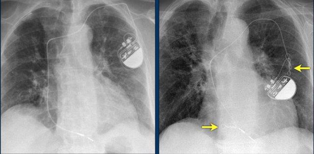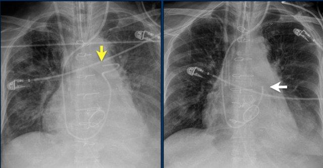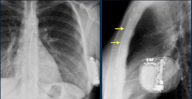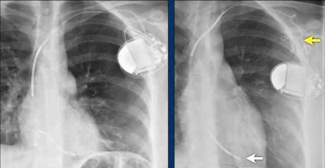 Vài tháng sau, thiết bị hoạt động không bình thường do hộp ICD và điện cực bị xoay (mũi tên vàng) và co rút lại (mũi tên trắng).