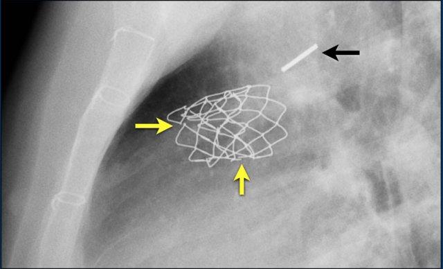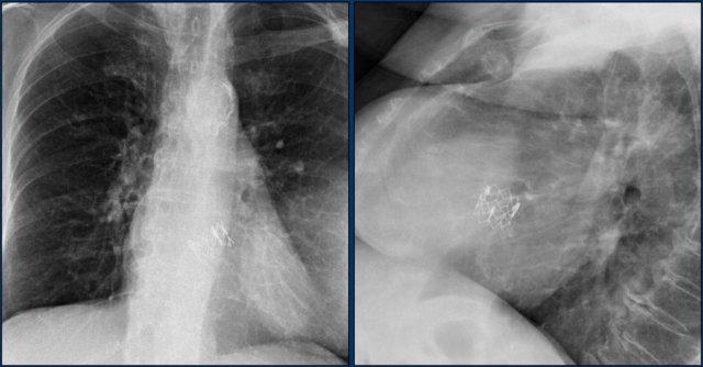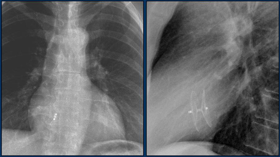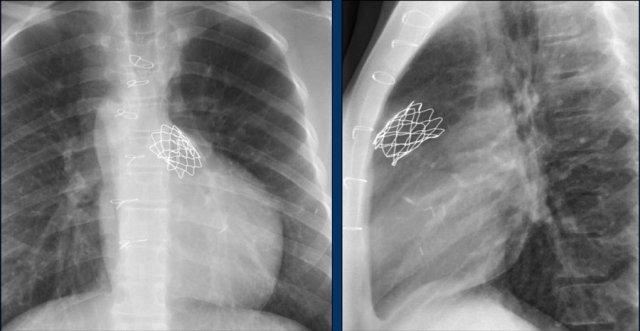 Hình ảnh chiếu bên của một trẻ em bị thông liên nhĩ với thiết bị bít lỗ thông Amplatz.
