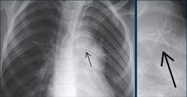 Hình ảnh chiếu bên của một trẻ em bị thông liên nhĩ với thiết bị bít lỗ thông dạng ô Rashkind.