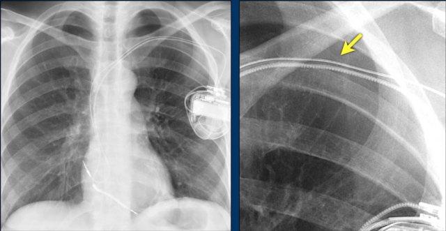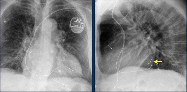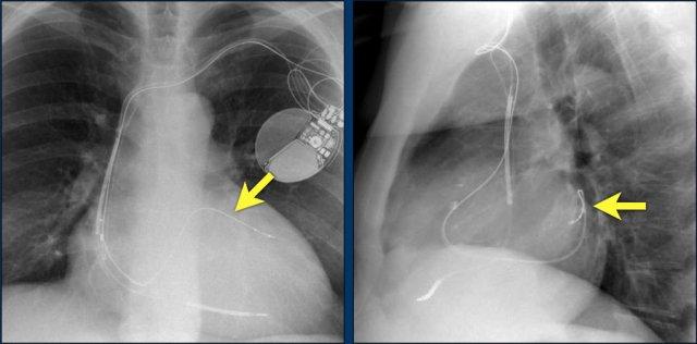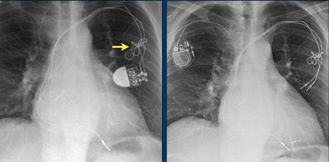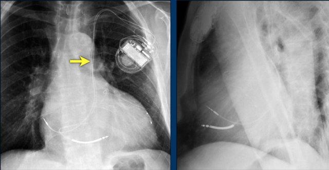 Lưu ý hình ảnh điện cực bị cuộn xoắn gần máy tạo nhịp và tại đầu điện cực trong thất phải (mũi tên).