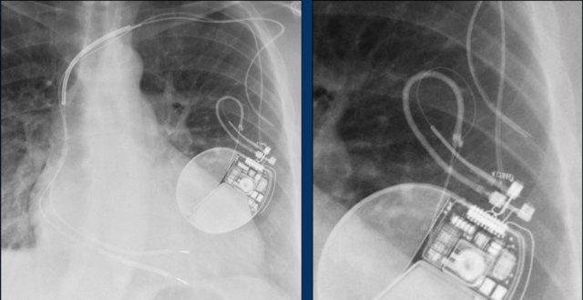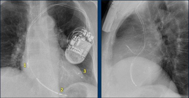Đây là ví dụ về một ICD với các điện cực đặt tại tiểu nhĩ phải, mỏm thất phải và một điện cực đến thất trái qua tĩnh mạch vành sau.