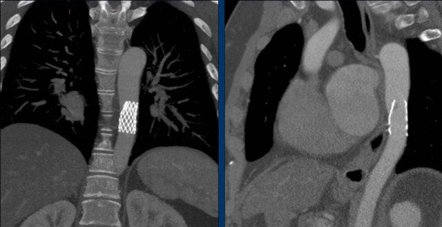Stent ghép sau đó được nở ra để bắc qua và che phủ vị trí tổn thương động mạch chủ (tài liệu tham khảo).