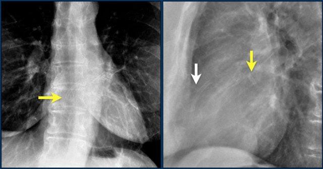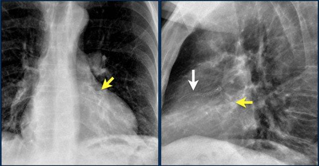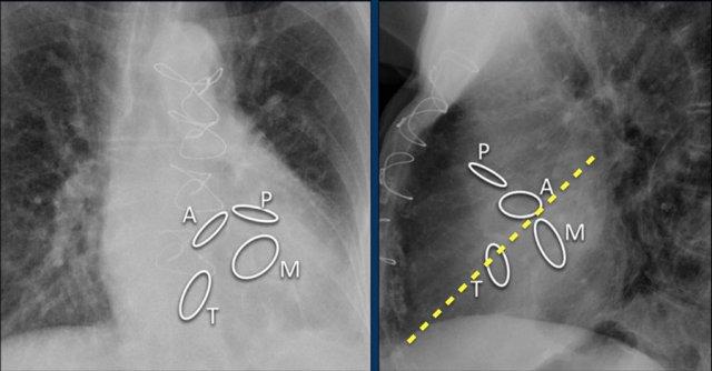 Hình ảnh thể hiện vị trí van tim bình thường trên phim X-quang ngực thẳng (PA) và nghiêng.