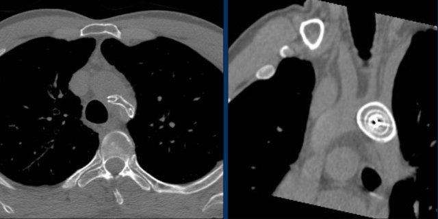Hình ảnh CT cắt ngang và tái tạo mặt phẳng coronal của cùng một bệnh nhân.