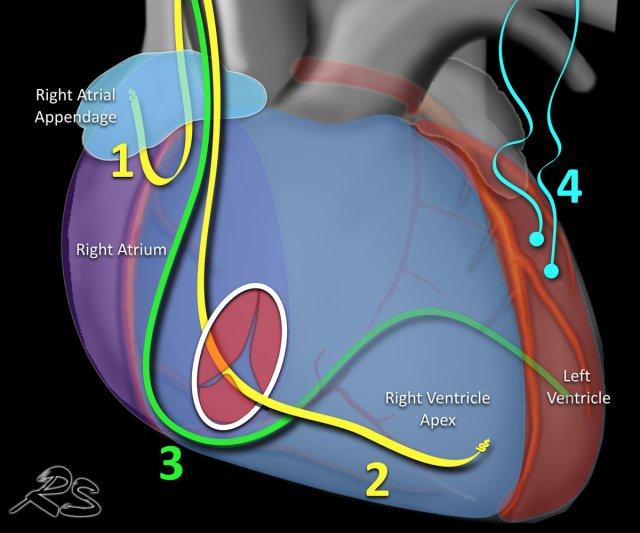 Điện cực thất trái đi qua nhĩ phải và xoang vành, cuối cùng được đặt ở phía sau vào một tĩnh mạch tim bên trái.