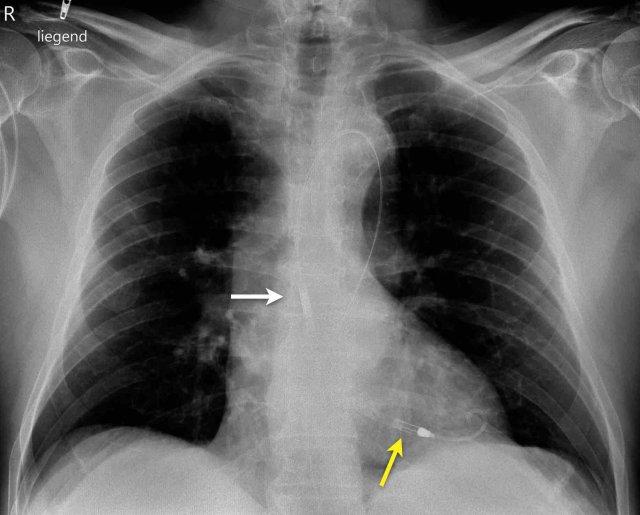 Hình ảnh X-quang ngực cho thấy vị trí đặt Impella đúng kỹ thuật với đầu vào (mũi tên vàng) và đầu ra (mũi tên trắng) lần lượt nằm ở tâm thất trái và động mạch chủ lên.