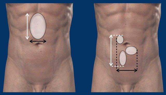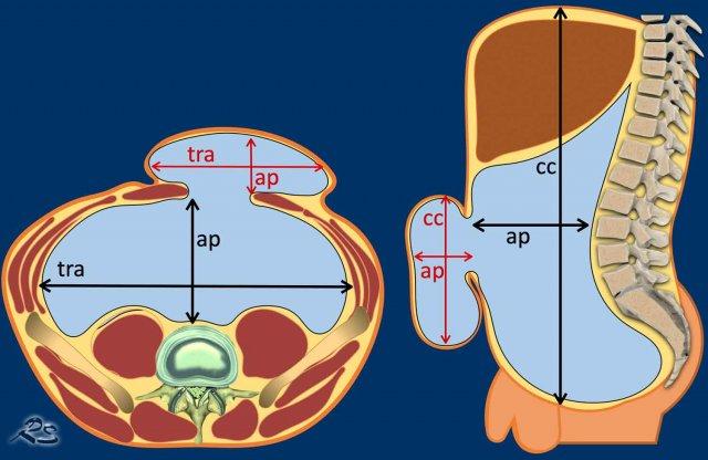 Chiều cao của khoang bụng được đo từ bờ trên của gan đến khớp mu, chiều rộng được đo giữa hai cơ ngang bụng ở hai bên.