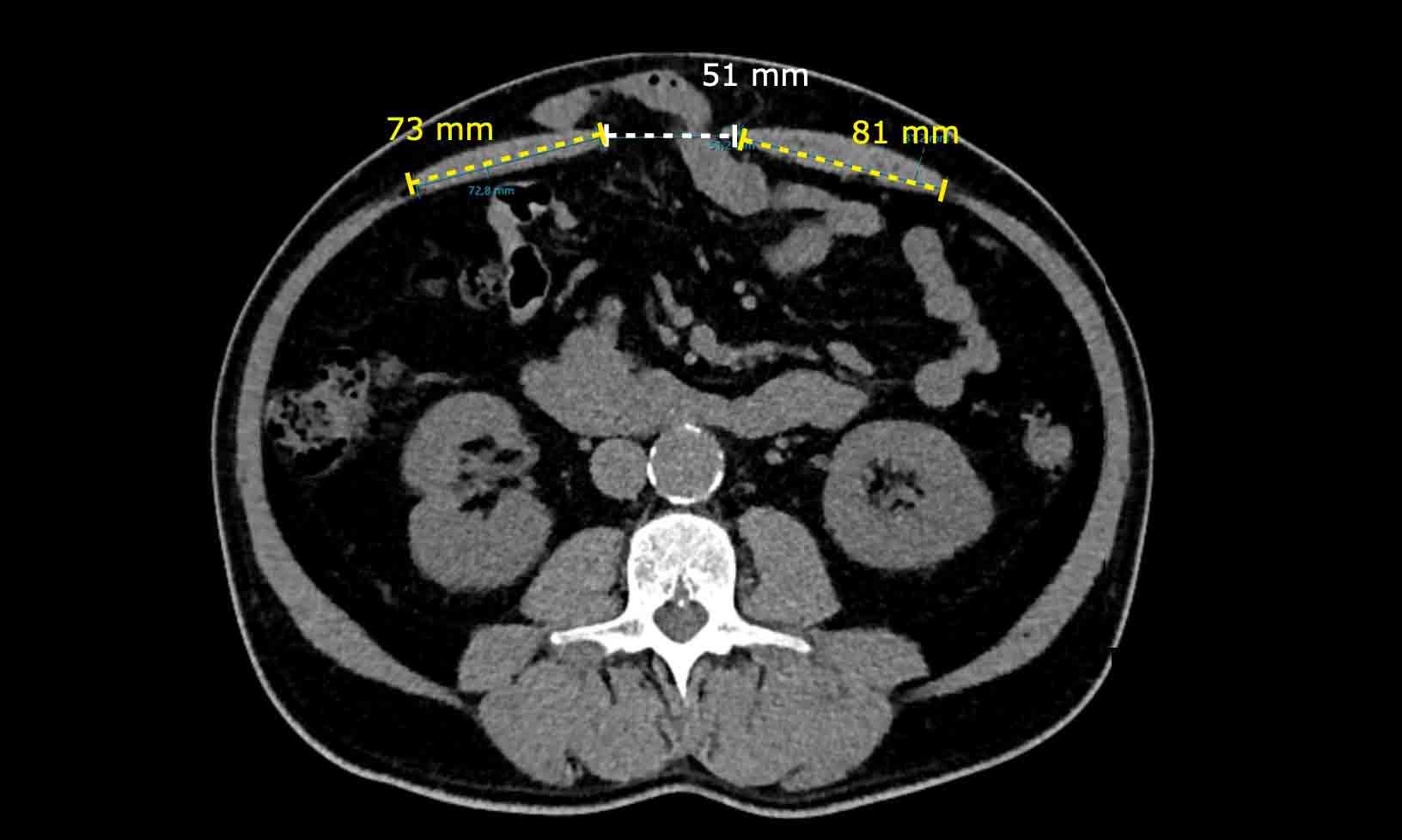 Ở một bệnh nhân khác, Tỷ lệ Cơ thẳng bụng trên Khuyết tật là: (73 mm + 81 mm) / 51 mm = 3.