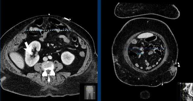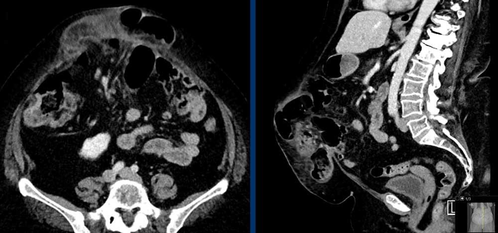 Lưu ý tình trạng thâm nhiễm mỡ và các quai ruột giãn với thành ruột tăng tỷ trọng nhẹ.