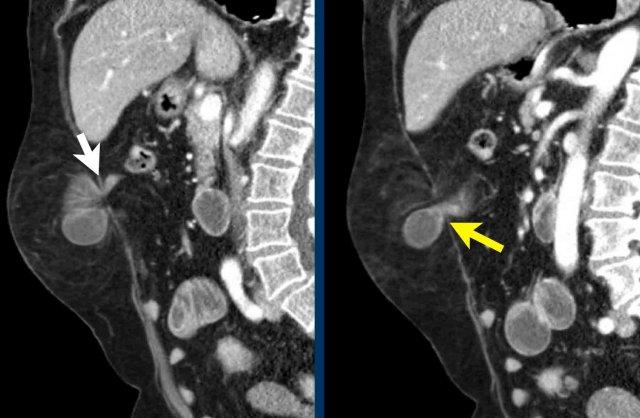 Lỗ thoát vị khá nhỏ và có hẹp tại điểm ruột đi vào túi thoát vị (mũi tên vàng) và tại điểm ruột thoát ra khỏi túi thoát vị (mũi tên trắng).