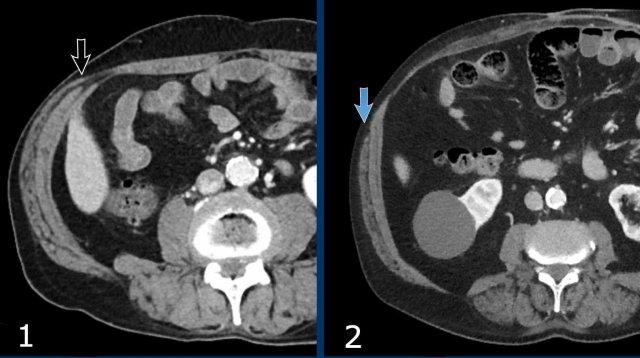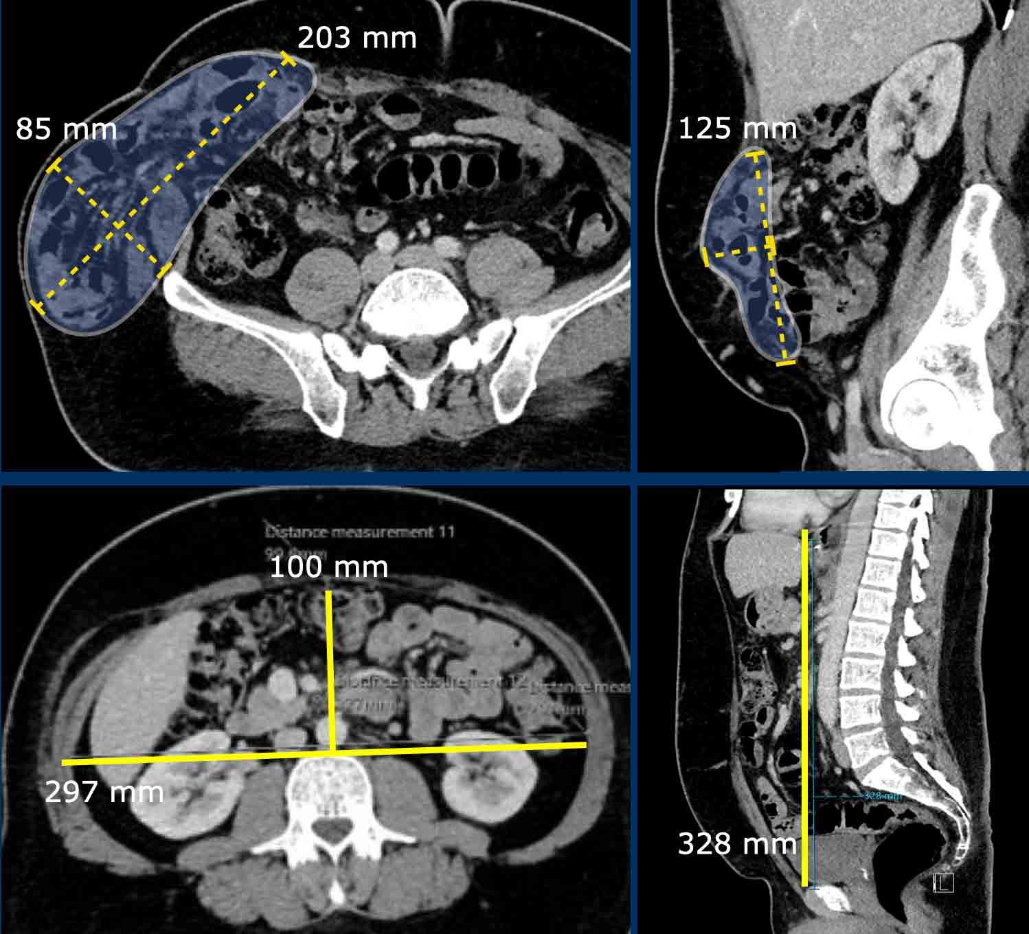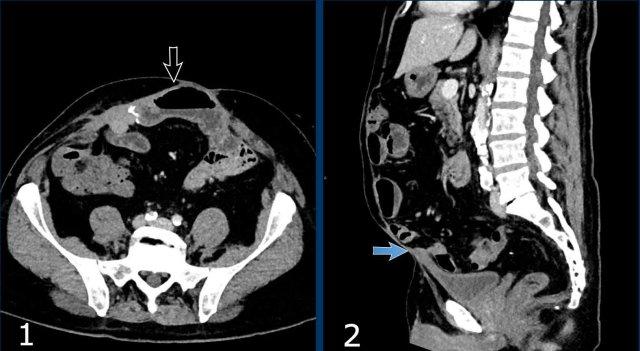 Các hình ảnh này thuộc về một bệnh nhân nữ 78 tuổi, béo phì nặng, có thoát vị thành bụng đường giữa sau phẫu thuật.