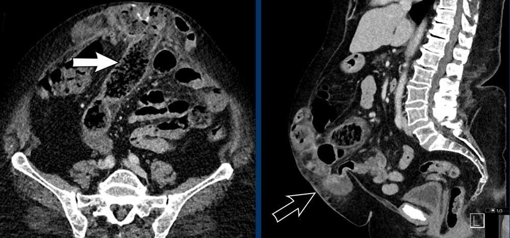 - Dấu hiệu phân trong ruột non mới xuất hiện, thấy rõ nhất trên các lát cắt ngang (mũi tên trắng).