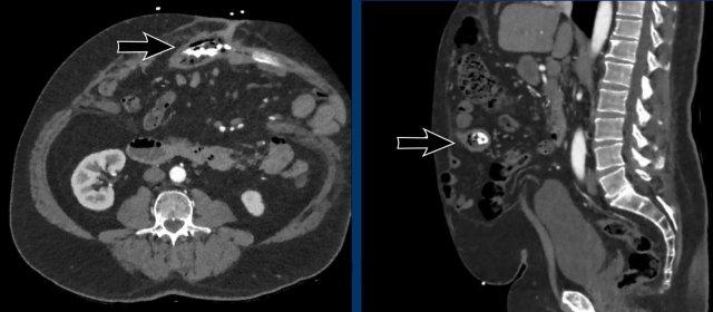 Một tấm lưới đã bị vôi hóa và di chuyển xâm lấn vào lòng ruột (mũi tên đen).