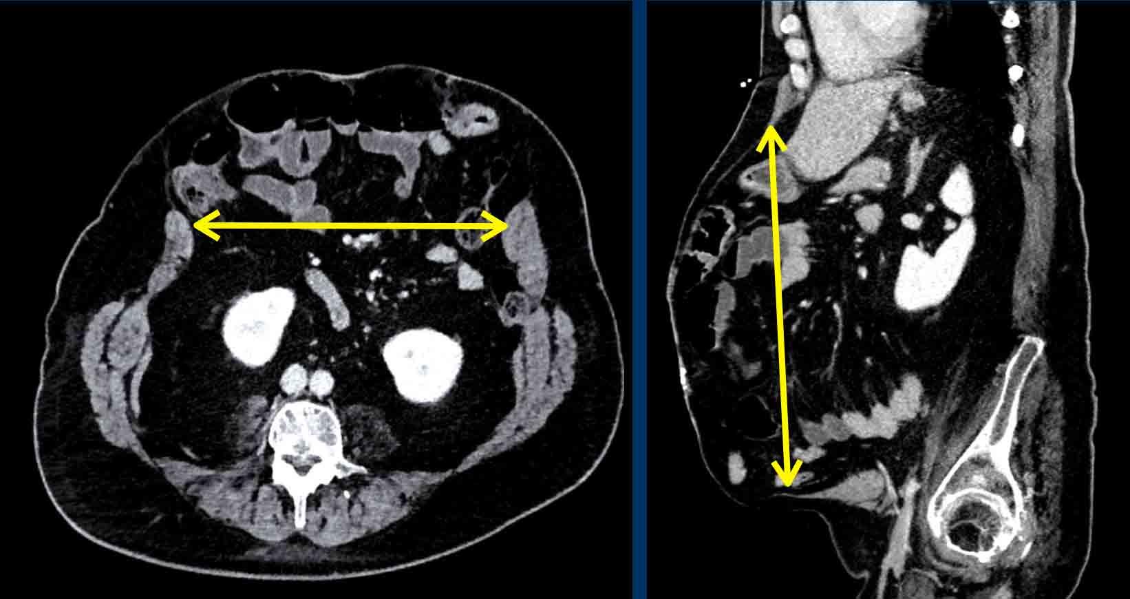 Nếu thành bụng trước không còn hiện diện do thoát vị thành bụng lớn, có thể ngoại suy từ phần thành bụng trước còn lại để đo chiều sâu khoang bụng.