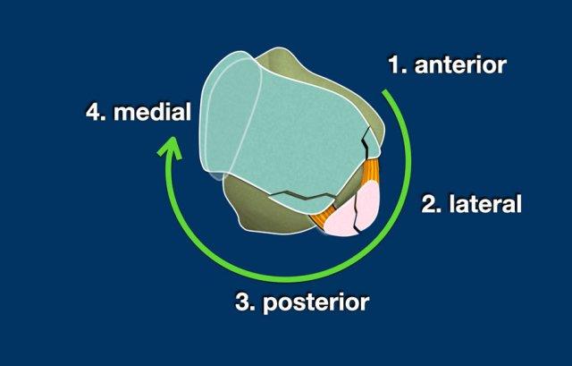 Trên mặt phẳng trục (axial), có thể thấy tổn thương bắt đầu ở phía trong do tư thế sấp của bàn chân và tiến triển theo chiều kim đồng hồ qua phía trước, phía ngoài đến phía sau.