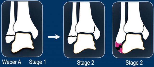 Tuy nhiên, khi kèm theo gãy xương mắt cá trong theo chiều dọc (push-off fracture), thì được xếp vào giai đoạn 2 và khớp cổ chân không vững, do vòng vững chắc bị phá vỡ ở hai vị trí.