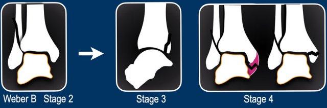 - Giai đoạn 4 là tổn thương khớp chày mác xa phía sau, đôi khi không thể nhìn thấy, nhưng sẽ bị nghi ngờ nếu có sự giãn rộng của khớp cổ chân hoặc khi có mảnh avulsion của mắt cá sau (malleolus tertius) như được thấy trong hình minh họa.
