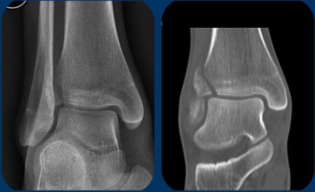 Trên tư thế chụp thẳng (AP) và tái tạo CT mặt phẳng coronal, chúng ta thấy gãy xương Tillaux ở giai đoạn 1. Không ghi nhận tổn thương gãy xương nào khác.