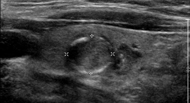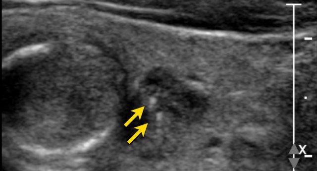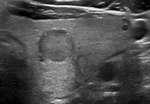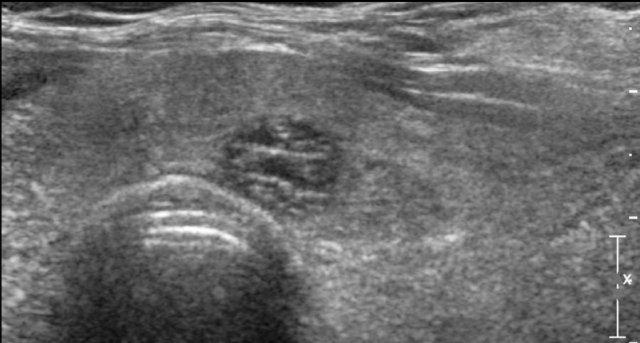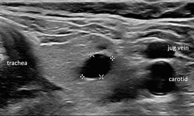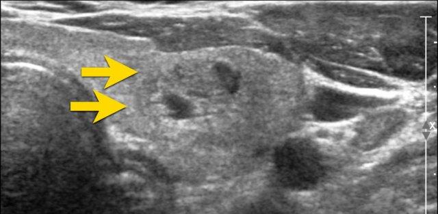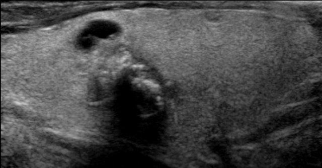 Nốt này giảm âm so với mô tuyến giáp bình thường có thể nhìn thấy ở mặt bụng của nốt.