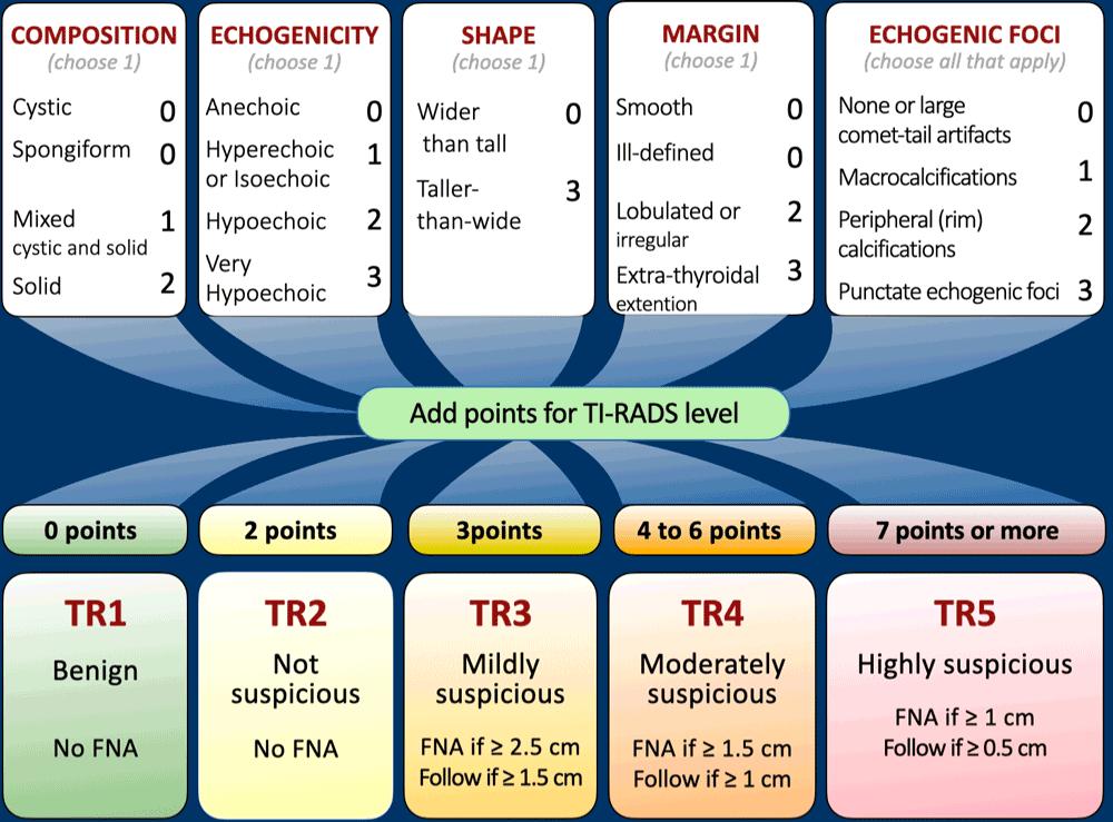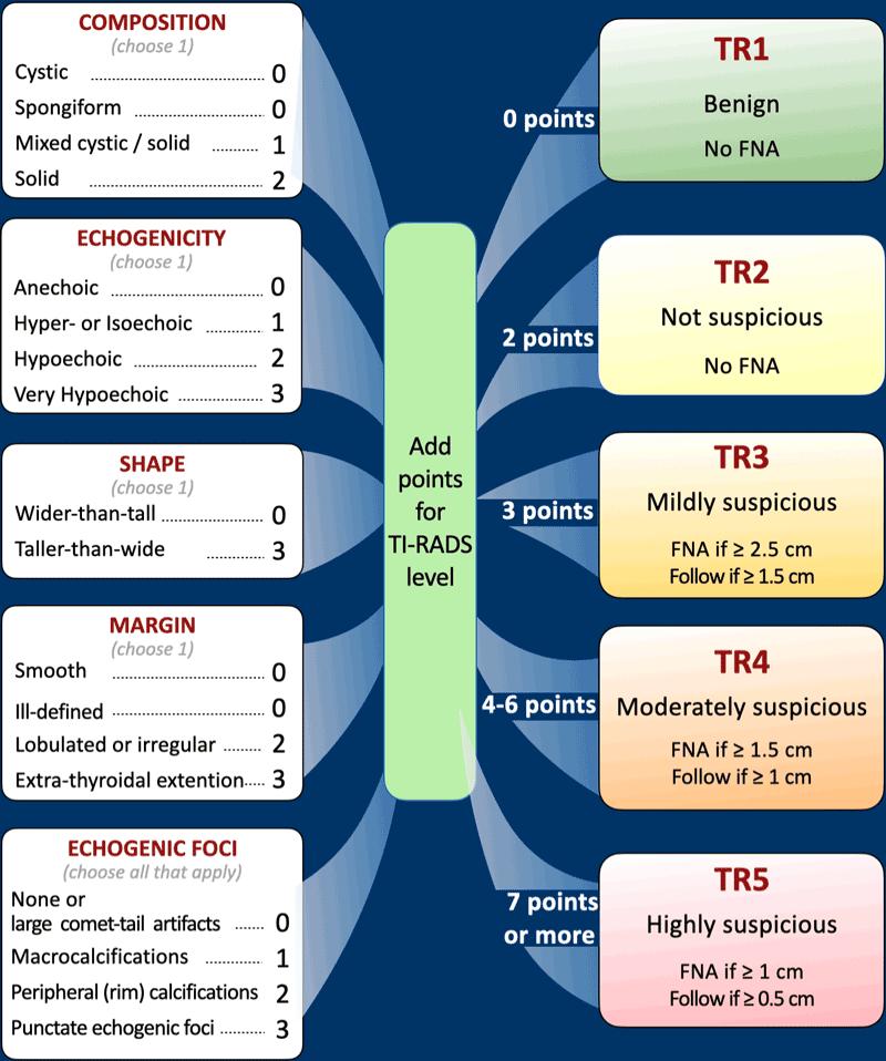 Hệ thống Báo cáo và Dữ liệu Hình ảnh Tuyến giáp (TI-RADS) của Trường Cao đẳng X quang Hoa Kỳ (ACR), được giới thiệu vào năm 2017, được phát triển nhằm giảm thiểu các sinh thiết không cần thiết đối với các nhân lành tính và nâng cao độ chính xác chẩn đoán.