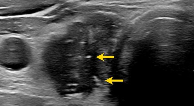 Lưu ý rằng, trong hình ảnh được cung cấp, tổn thương có độ giảm âm cao hơn so với các cơ dải (được chỉ bởi các mũi tên).