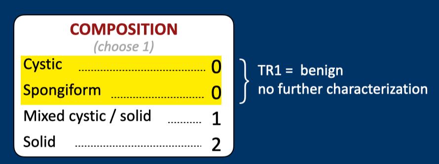 Tổn thương dạng nang, hoặc những tổn thương gần như hoàn toàn là nang, được coi là lành tính và được phân loại là TI-RADS 1.
