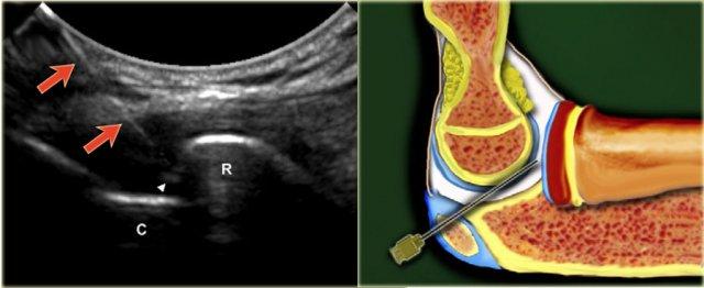 Đầu dò được đặt trên khớp để hiển thị khoang khớp. Kim (cỡ 22, dài 30 mm) được hướng theo góc đầu-đuôi nhẹ ở phía lưng-ngoài của khớp về phía khoang khớp, nhắm đến bề mặt khớp của chỏm quay.