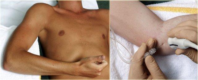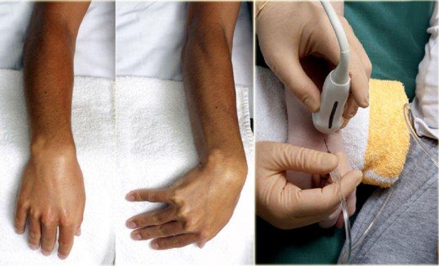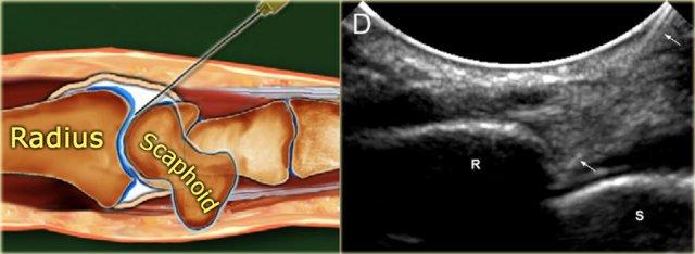 Một kim 23-25 gauge, dài 30 mm được đưa vào khớp dưới hướng dẫn của siêu âm, hướng về phía bề mặt khớp của xương quay cho đến khi cảm nhận được sự tiếp xúc với xương quay.