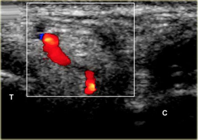 Tùy thuộc vào mức độ viêm, có thể có hiện tượng xung huyết trong khoang và có thể thấy các mạch máu xen kẽ, những mạch máu này cần được tránh. Điều này tương đối dễ dàng, đặc biệt khi sử dụng doppler màu