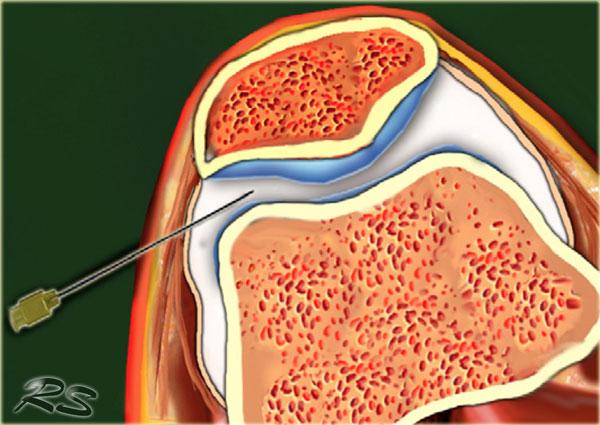Đối với việc tiêm, chúng tôi không sử dụng hướng dẫn siêu âm mà sử dụng quy trình “mù” tiêu chuẩn, đưa kim (cỡ 21, dài 50 mm) vào phía sau xương bánh chè theo đường tiếp cận bên giữa xương bánh chè.