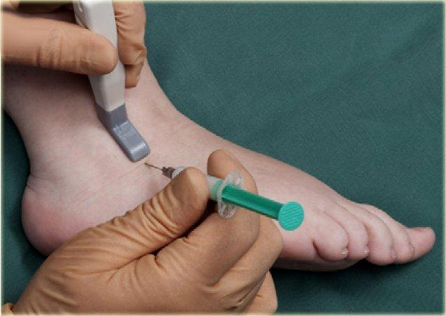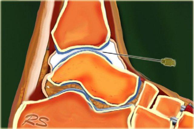 Tiêm dưới hướng dẫn siêu âm vào xoang cổ chân bên phải với đường vào từ phía ngoài. Đầu dò được giữ theo mặt phẳng chếch vành. Kim được đưa vào dọc theo trục dài của đầu dò.