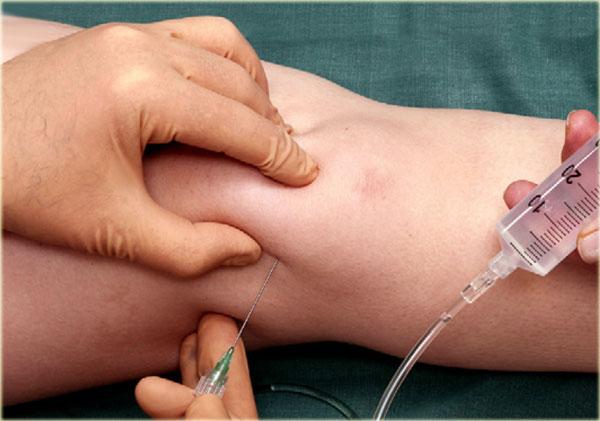Cảm nhận được sự tiếp xúc và một lần nữa đảm bảo rằng đầu kim không chạm vào sụn xương chày và mặt vát của kim hướng vào trong khớp.