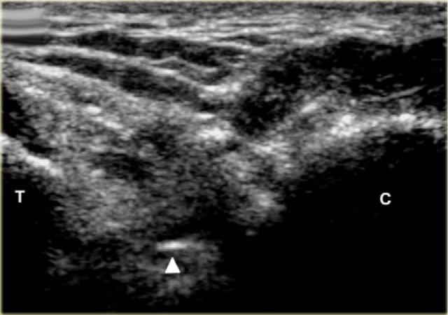 C. Siêu âm sau khi tiêm 15 mL thuốc cản quang. Vị trí đúng của kim trong khớp có thể được quan sát trực tiếp trong thời gian thực khi tiêm, đồng thời được xác nhận bởi hình ảnh cấu hình dạng ‘dấu phẩy’ của sụn viền posterior (đầu mũi tên), được nâng lên bởi dịch tiêm vào trong khớp.
