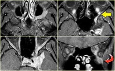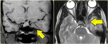 Điều này được minh họa trong trường hợp bên trái ở một bệnh nhân có biểu hiện bất thường nhiều dây thần kinh sọ.