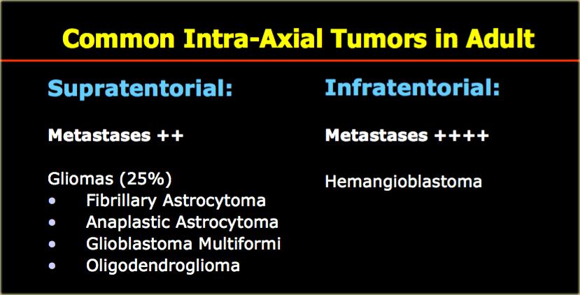 Mặt khác, ở người trưởng thành, u trong trục sẽ là di căn hoặc u tế bào hình sao (astrocytoma) trong 75% các trường hợp.