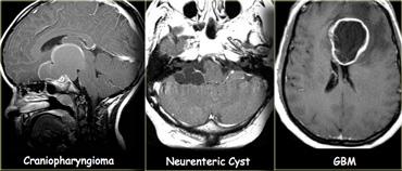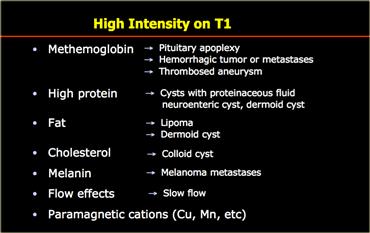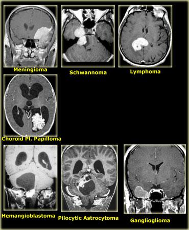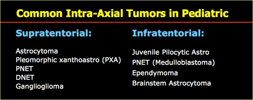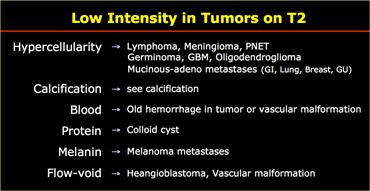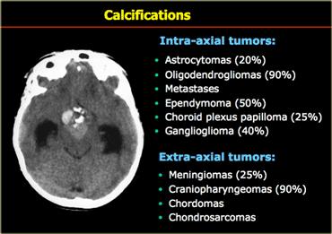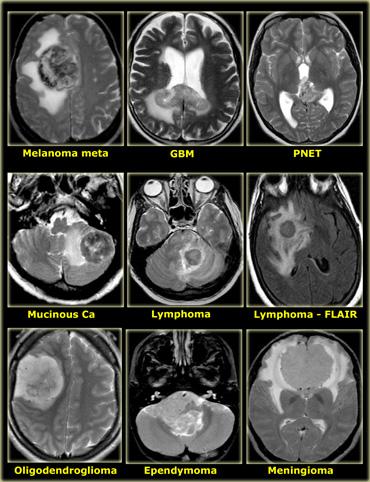 Điều này được thấy trong PNET, u màng nội tủy (ependymoma), u nguyên bào đa hình (GBM), u lympho, u tế bào ít nhánh (oligodendroglioma) và u nhú đám rối mạch mạc (choroid plexus papilloma).