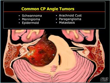Các khối u góc cầu tiểu não (CP) thường gặp được liệt kê trong bảng bên trái.