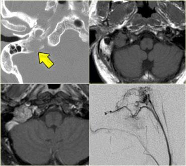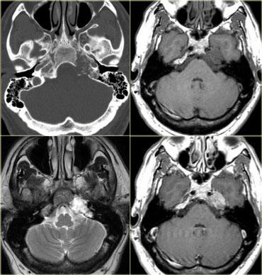 Hình bên trái là một ví dụ về u cận hạch (Paraganglioma) nền sọ.