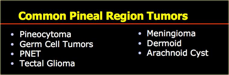 Các khối u vùng tuyến tùng thường gặp được liệt kê trong bảng bên trái.