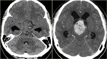 Hình bên trái là CT không tiêm và CT có tiêm thuốc cản quang của bệnh nhân nữ 33 tuổi với biểu hiện đau đầu dữ dội (nặng hơn vào buổi sáng), giảm thị lực và thu hẹp thị trường, kèm phù gai thị.