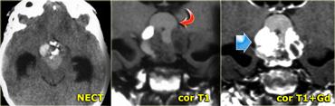 Có một khối ngấm thuốc nằm phía trước nền sọ và trong vùng xoang hang bên phải.