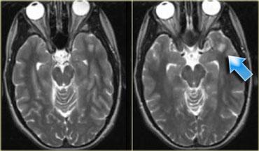 Bên trái là hình ảnh của một khối u nằm ở bán cầu não phải.