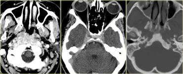 Hình bên trái là hình ảnh CT của bệnh nhân nam 58 tuổi với biểu hiện đau và tê mặt bên phải khởi phát từ từ, kèm theo nhìn đôi mới xuất hiện gần đây.