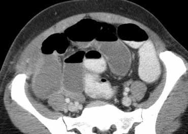 Dày thành các quai ruột non thường gợi ý viêm khu trú, do các khối u ruột non (carcinoid, lymphoma, GIST) tương đối ít gặp.