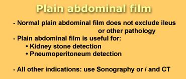 Do đó, phim bụng không chuẩn bị hiếm khi hữu ích, ngoại trừ trong phát hiện sỏi thận hoặc tràn khí phúc mạc.