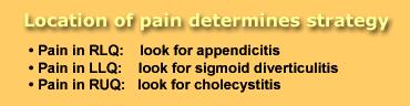 Sau khi loại trừ các bệnh lý thường gặp, cần tìm kiếm các dấu hiệu của bất kỳ bệnh lý nào khác bằng cách khảo sát có hệ thống toàn bộ ổ bụng.