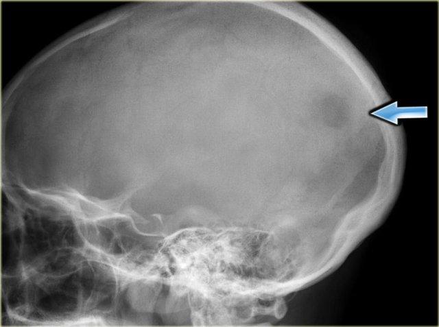 Ở bên trái là hình ảnh điển hình của u hạt bạch cầu ái toan trong hộp sọ dưới dạng tổn thương tiêu xương không rõ ranh giới.