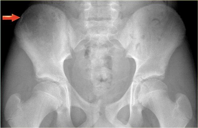 Bên trái là tổn thương tiêu xương không rõ ranh giới ở xương chậu phải của một bệnh nhân trẻ, có thể dễ dàng bị bỏ sót.