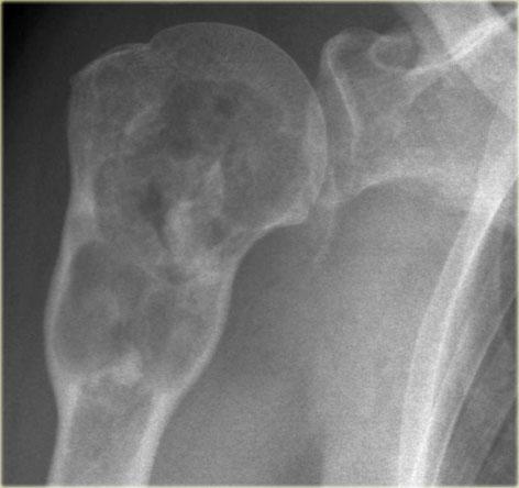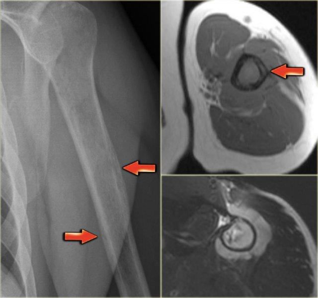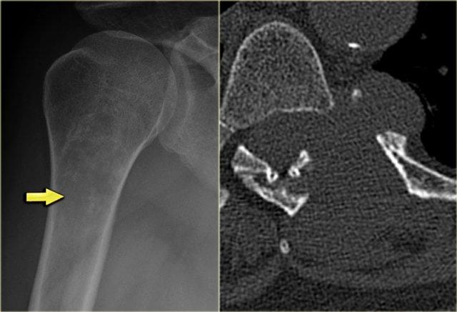 Bên trái là tổn thương hỗn hợp tiêu xương và xơ cứng ở đầu trên xương cánh tay với phá hủy vỏ xương không đều.