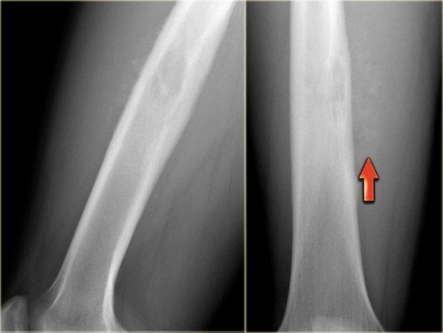 Bên trái là một tổn thương tiêu xương không rõ ranh giới ở xương đùi của bệnh nhân trẻ tuổi.